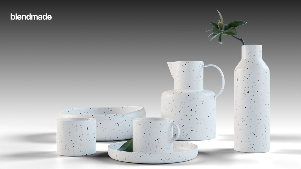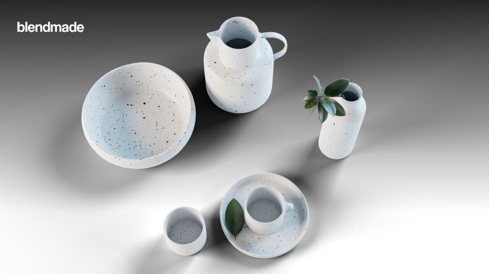 Blend File content: - 2 mugs -1 saucer (plate) -1 pitcher -1 bowl -1 vase with a plant -studio setup with all lights and cameras